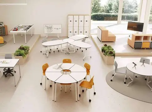 La disposición de los muebles escolares dentro de las aulas del futuro no es la prototípica de alumnos sentados en pupitres mirando al docente, sino otorgándoles movimiento por todo el aula. Por esta razón, el mobiliario debe ser flexible, móvil y apilable, permitiendo fácilmente nuevas configuraciones dentro del aula, sin perder el trabajo individual que sigue siendo importante dentro del desarrollo personal del alumno. Este concepto viene precedido por la incursión de un nuevo concepto lectivo que se traduce a como se equipa un aula escolar: El Mobiliario Colaborativo.
