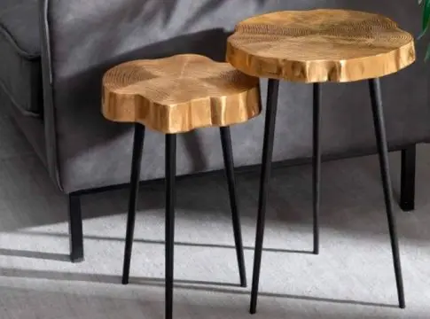 El juego de mesas auxiliares modelo Wood darán ese rústico glamuroso para el salón, combinable con unos taburetes altos tapizados en polipiel como el modelo Satino.