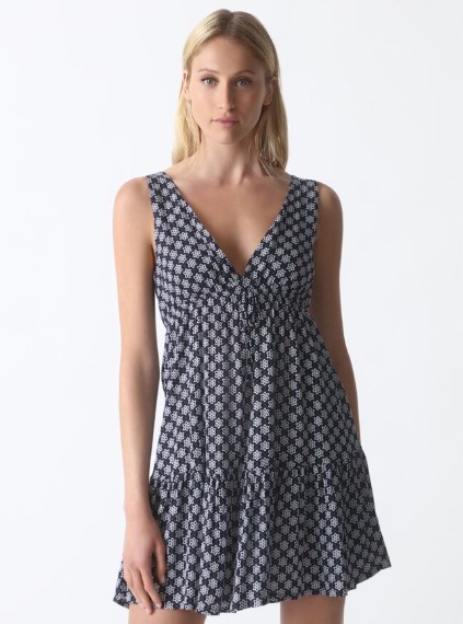 Este vestido de Lefties es corto, con tirantes anchos que proporcionan comodidad y sujeción. El diseño de la prenda presenta una falda con vuelo, lo que le da un aspecto ligero y femenino. Para asegurar un mejor ajuste, el vestido cuenta con una lazada debajo del pecho, lo que permite ajustarlo a la medida deseada. El vestido está confeccionado en un tejido fluido, lo que significa que es suave, ligero y cómodo de llevar. Este tipo de tejido proporciona libertad de movimiento y permite que la prenda se adapte a las formas del cuerpo de manera favorecedora. Precio: 6 euros.
