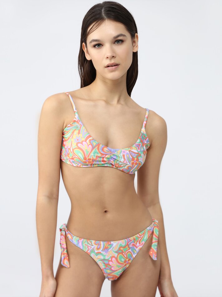 El set de baño de dos piezas con fruncido es una opción elegante y cómoda para disfrutar de un día en la playa o en la piscina. El sujetador cuenta con frunce en el escote y estampado con relleno extraíble, mientras que la braguita tiene un corte clásico con lazada lateral.