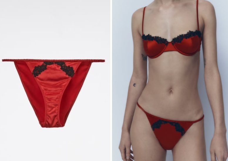 Si te ha gustado el sujetador en tejido satinado y encaje, la braguita que encontrarás en Zara te parecerá la ideal para combinar y lucir siempre fantástica. Esta braga está confeccionada en el mismo tipo de tejido y con encaje negro suave en contraste; además, cuenta con cintura de goma fina y elástica.