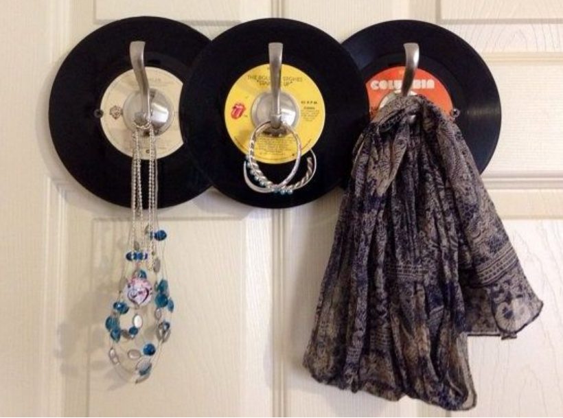 Otro de los usos que puedes darle a tus vinilos es hacer un perchero muy interesante y de estilo vintage. Hacerlo es muy sencillo, y solamente necesitas pegamento resistente, pomos o ganchos y por supuesto, los vinilos.