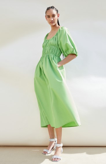 El vestido verde de Sfera es de longitud larga y está confeccionado en popelín, un tejido liviano y transpirable. Tiene mangas abullonadas creando un efecto de pliegues suaves y elegantes. En el área del pecho, presenta un detalle de fruncido con goma. Esto no solo agrega un toque de estilo, sino que también proporciona un ajuste cómodo y favorecedor. En cuanto al precio, se indica que el vestido está disponible por 19,99 €.