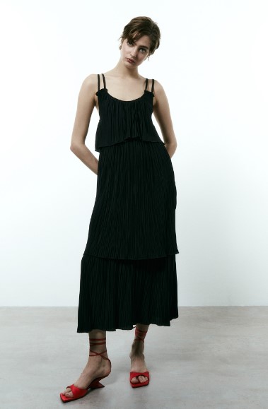 El vestido negro de Sfera es de longitud midi y presenta paneles plisados en su diseño. Esto implica que hay secciones del vestido que están plisadas, es decir, dobladas en forma de pliegues, creando un efecto de textura y movimiento en la prenda. Los tirantes del vestido son finos y dobles, lo que significa que hay dos tirantes delgados en cada hombro. Estos tirantes aportan un toque delicado y femenino al diseño. En cuanto al precio, se indica que el vestido está disponible por 15,99 €.