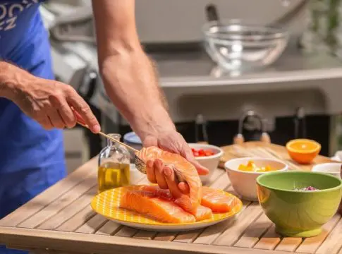 - Mantener la piel y cocinar el salmón o el bacalao noruego por ese lado.