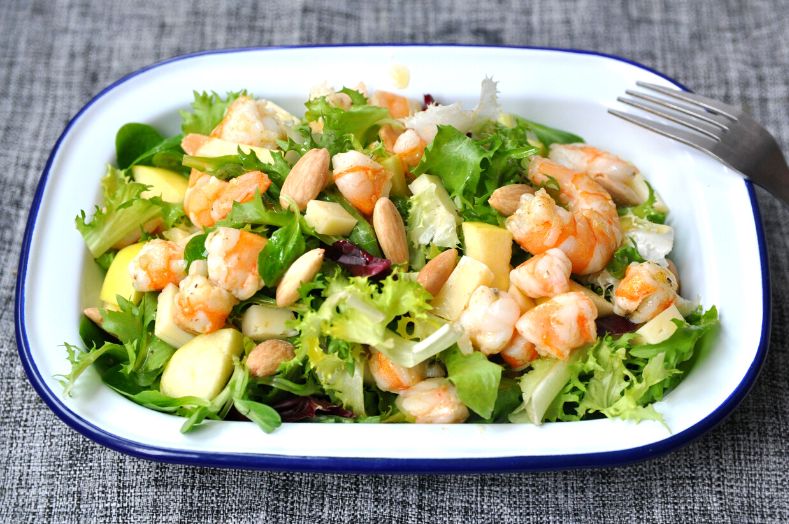 Si prefieres, puedes utilizar langostinos cocidos en lugar de saltearlos. También puedes sustituir la manzana por otra fruta dulce y utilizar otros frutos secos, como nueces, anacardos o pistachos. Si no te gusta el queso, puedes eliminarlo o utilizar otro queso suave que te guste.