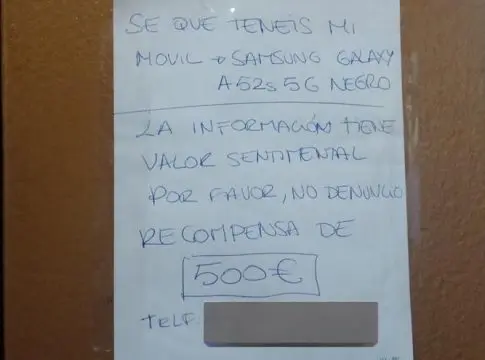 La joven decidió acercarse al lugar y con la ayuda de una vecina ha dejado unos papeles en el portal del edificio con la esperanza de que alguien se conmueva y devuelva el móvil, “Como última opción he puesto estos papeles en el portal. No va a servir pero es lo único que podía hacer sin salir yo posiblemente herida / aterrada”.