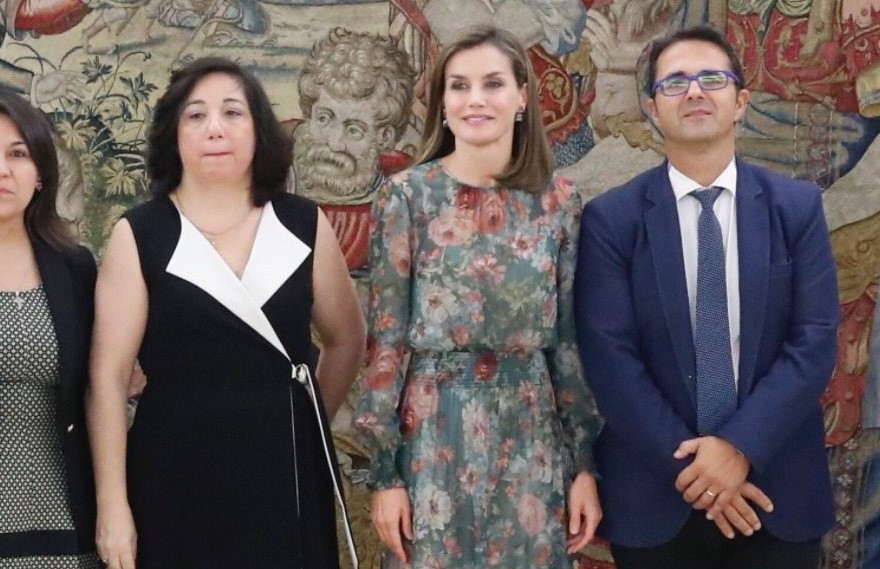 El vestido de Zara usado por Letizia en 2017 es una prenda midi de color verde con un estampado floral en tonos rosados, con un tejido transparente. Su corte y detalles como la goma en la cintura y los puños, junto con el cierre en la espalda, realzan su elegancia y lo convierten en un auténtico objeto de deseo.