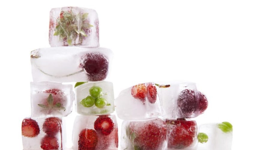 Los hielos de frutas consisten en hacer cubos de hielo con trozos pequeños de frutas frescas, para luego congelarlas. Se emplea para darle sabor a los cócteles a medida que se derrite el hielo de frutas.