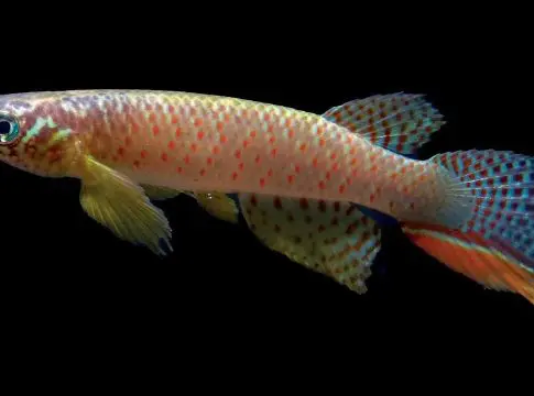 Este tipo de pez puede llegar a medir unos 5 centímetros, vive en charcos o ecosistemas de agua temporales y tiene un patrón de puntos de colores.