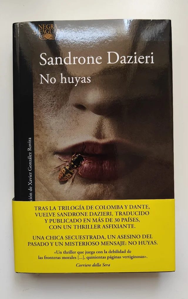 No huyas, una novela de Sandrone Dazieri publicada por primera vez este año 2023. Es una novela fascinante, escalofriante e impactante, cuenta de la historia de un secuestro, el secuestro de Amala Cavalcante, sobrina de una famosa abogada Francesca Cavalcante, y pronto que descubre que fue secuestrada por un asesino al que le toco defender y fue condenado, en la búsqueda por rescatar a su sobrina encuentra a una de serie de personajes extravagantes en el camino.