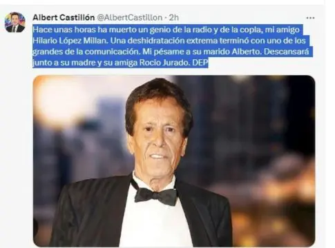 La noticia de su fallecimiento fue confirmada en un post en la red social X por el también periodista y amigo Albert Castillón. "Hace unas horas ha muerto un genio de la radio y de la copla, mi amigo Hilario López Millan. Una deshidratación extrema terminó con uno de los grandes de la comunicación. Mi pésame a su marido Alberto. Descansará junto a su madre y su amiga Rocio Jurado. DEP", ha escrito Castillón en esta red social.