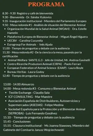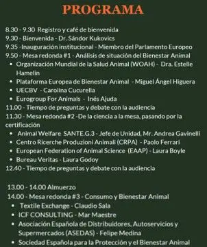 Como punto de partida, la primera mesa redonda con el título "Análisis de la situación del Bienestar Animal" y la participación de la Dra. Estelle Hamelin, de la Organización Mundial de la Salud Animal (WOAH), de Miguel Ángel Higuera, de la Plataforma Europea de Bienestar Animal, Carolina Cucurella, de la UECBV, e Inés Ajuda del Eurogroup For Animals, hará una exposición sobre cuál es la situación actual del bienestar animal a nivel europeo.