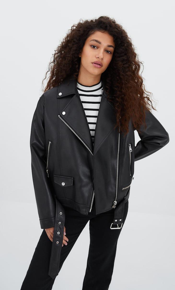 Esta chaqueta de cuero de Stradivarius es perfecta para añadir un toque juvenil y cómodo a cualquier look. Su diseño moderno y versátil la convierte en una pieza clave para crear outfits chic y estar a la moda en cualquier ocasión.