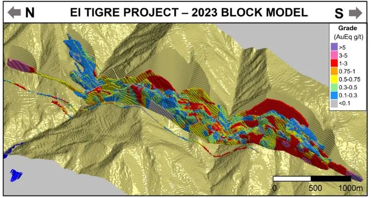 El potencial de exploración en el Proyecto El Tigre es sustancial con áreas prospectivas para la exploración tanto en profundidad como a lo largo del rumbo con el objetivo revelado de establecer de 7 a 9 millones de toneladas de 225 a 265 g/t AgEq para 50 a 75 Moz AgEq.