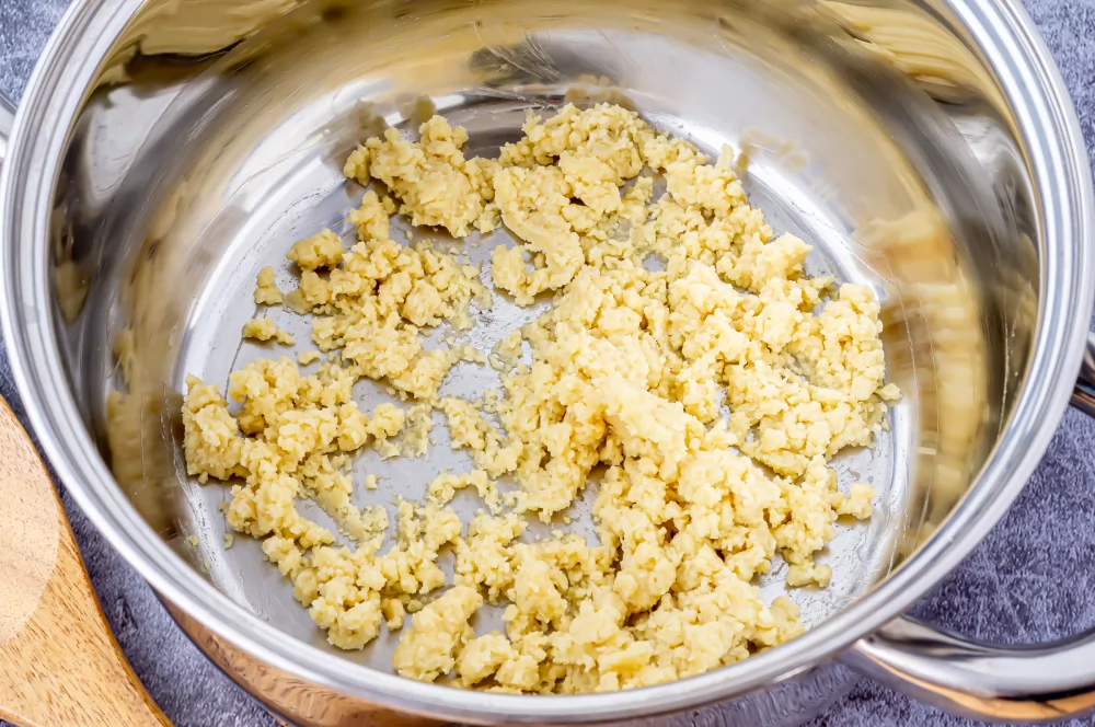 En un cazo, calienta 3 cucharadas de aceite de oliva. Una vez caliente, espolvorea 50 g de harina de trigo y mézclala cuidadosamente. Cocina la harina durante un par de minutos para eliminar el sabor crudo.