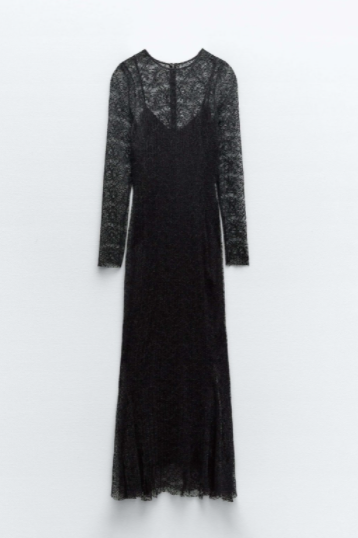 Otro de los clásicos para llevar en las Navidades son los tejidos en los que el encaje se convierte en protagonista, y en Zara, con este vestido tienes el éxito asegurado, pues, combina como base un vestido negro largo que se complementa con el más delicado encaje a tono.