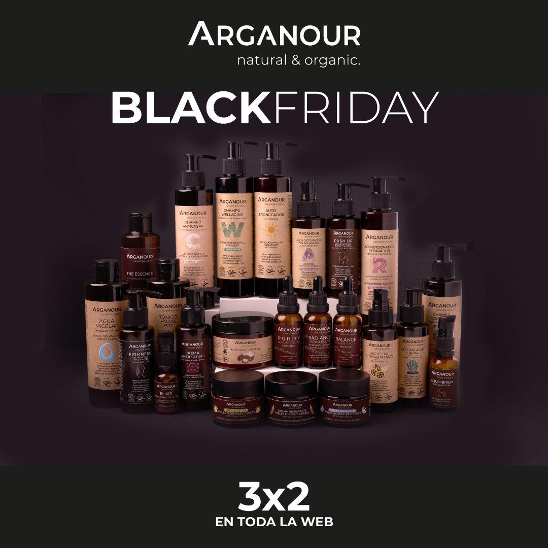 Del 20 al 26 de noviembre, Arganour ha preparado un 3x2 en toda su tienda online. Sí, se ha leído bien, al comprar 2 productos de cualquier categoría (facial, corporal, capilar, etc.) y el tercero es (el producto de menor valor) gratis.