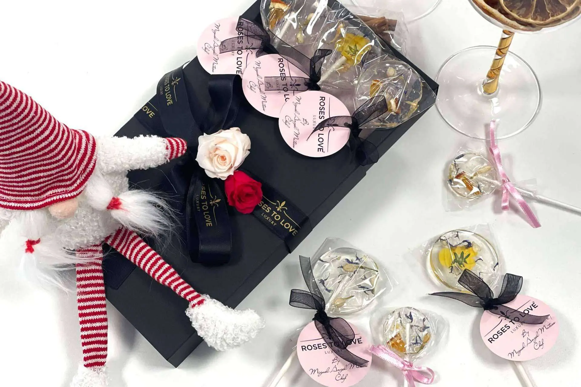 Cada piruleta es una obra de arte culinaria, cuidadosamente elaborada con flores frescas y seleccionadas a mano. No solo se deleitará el gusto, sino que también se engalanarán los sentidos con cada bocado. Roses to Love cuenta con el Chef Miguel Ángel Mateos para su elaboración de estos pequeños placeres con la intención de crear dulces recuerdos encapsulados en caramelo.