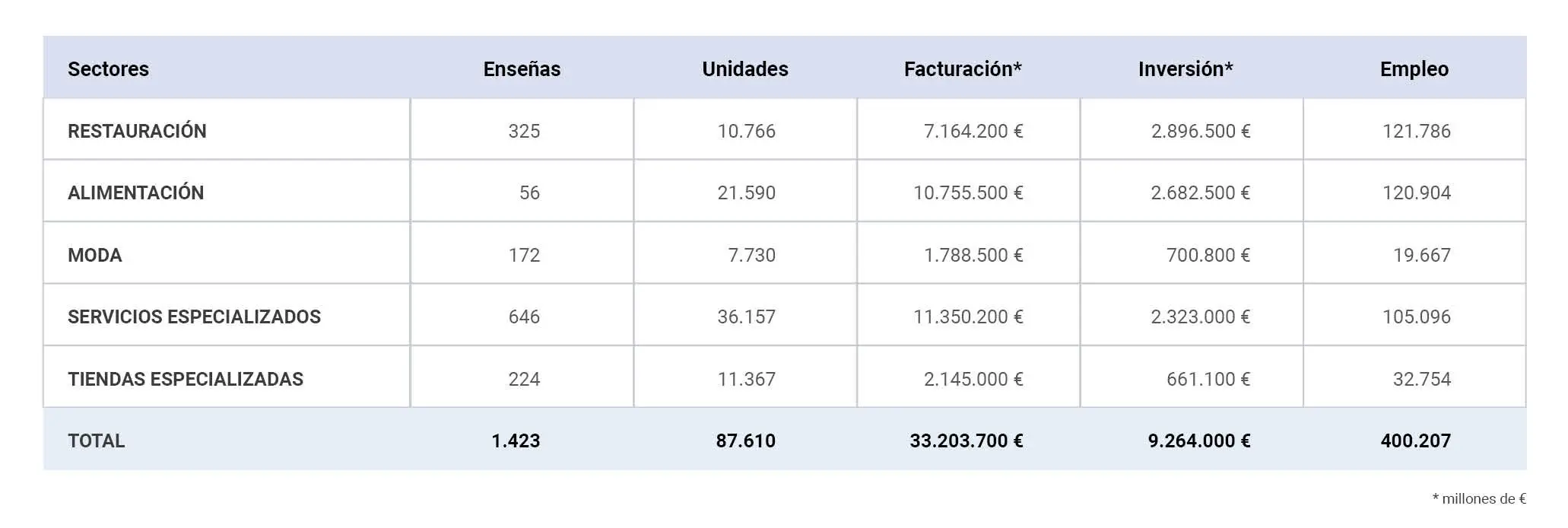 Dentro del sistema de franquicia, coexisten cerca de 80 sectores de actividad que se pueden agrupar en 22 sectores principales. En la imagen, se presentan los datos más relevantes para cada uno de los sectores principales, esto es, Restauración, Alimentación, Moda, Servicios Especializados y Tiendas Especializadas.
