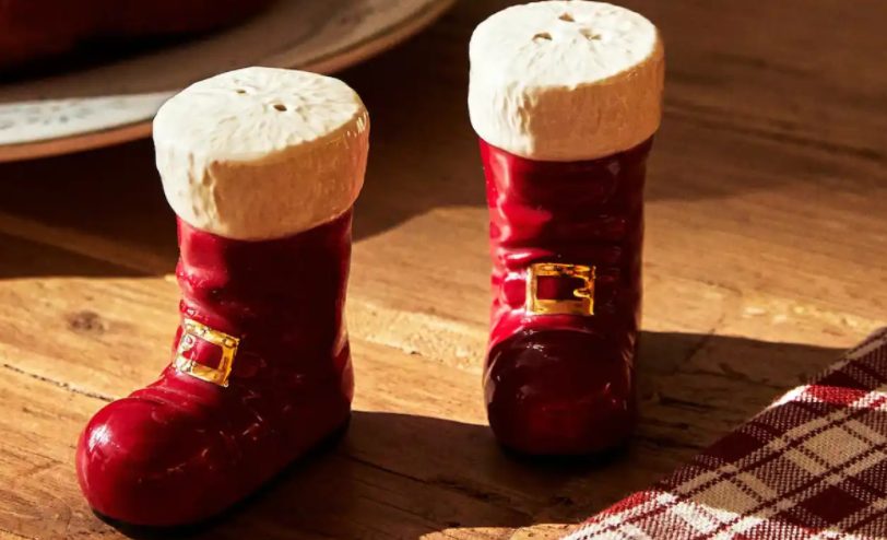 El set de salero y pimentero botas Papá Noel de Zara Home es un accesorio de mesa perfecto para las fiestas navideñas. Está hecho de gres de color rojo, con la forma de las botas de Papá Noel. El salero tiene una tapa con un pompón de color blanco y el pimentero tiene una tapa con un lazo rojo.