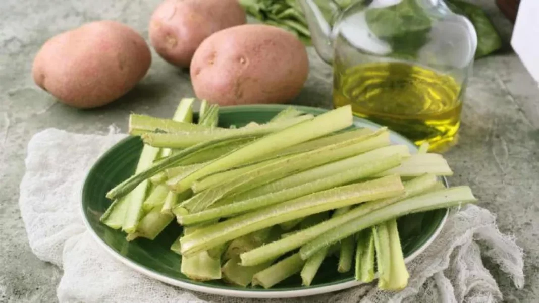 Para que las borrajas estén listas, coloca una olla con abundante agua a fuego medio, añade un poco de sal y una vez que le hayas quitado la pelusa a los tallos de borraja puedes agregarlos a la olla con agua caliente.