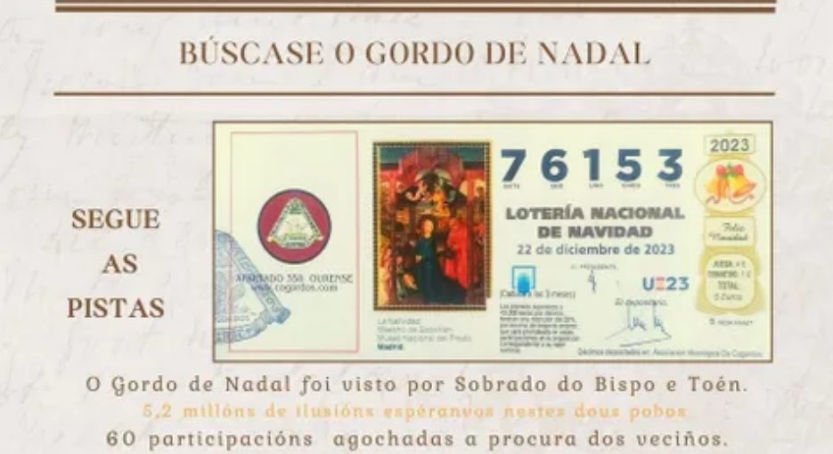 El Gordo de Navidad es un premio muy significativo en la Lotería de Navidad, con un premio de 400.000 euros al décimo o 20.000 euros por cada euro apostado, así que, para los habitantes de las aldeas de Sobrado do Bispo y Moreiras (en Toén), en la provincia de Ourense, en el corazón de Galicia, encontrar una de las 60 participaciones de Lotería de Navidad, repartidas en 47 ubicaciones distintas, es todo un interesante desafío.