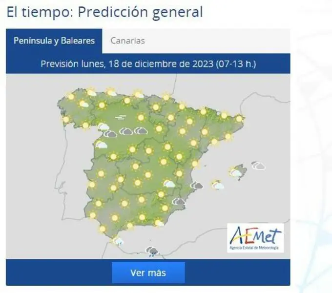 En la jornada de este lunes, únicamente se esperan intervalos nubosos en Baleares, área del Estrecho y, con probabilidad de dejar alguna precipitación débil y ocasional, en Melilla, tendiendo en general a remitir para quedar poco nuboso.