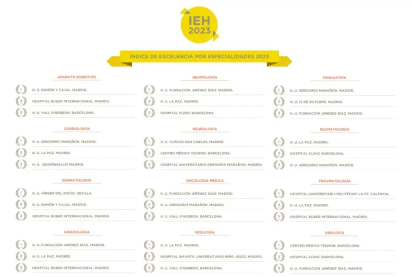 En tercer lugar, se encuentra el IEH Especialidades que, también anualmente, descubre cuáles son los tres principales centros en doce disciplinas médicas y/o quirúrgicas, y que lidera, una vez más, la Fundación Jiménez Díaz al estar en el puesto uno en tres de ellas: Ginecología, Neumología y Oncología Médica.
