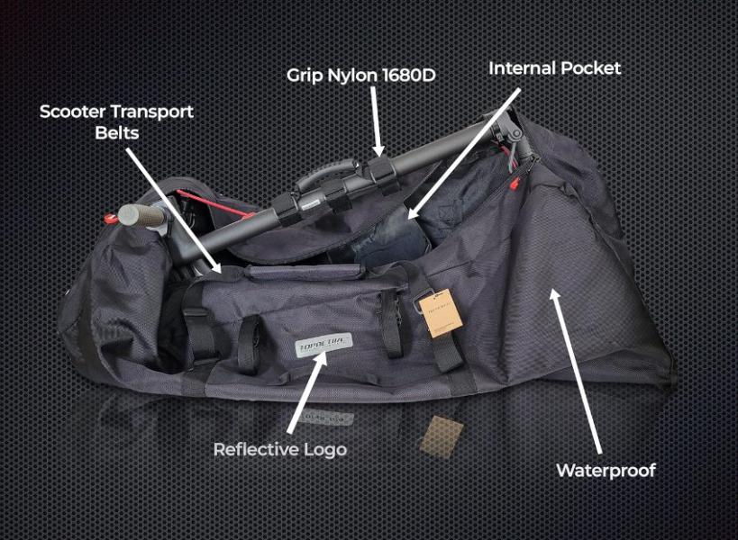 Para comenzar, el usuario pliega su patinete eléctrico y lo coloca cuidadosamente dentro de la bolsa. La bolsa, confeccionada con tela Oxford impermeable de color negro, no solo ofrece una apariencia discreta, sino que también cuenta con un diseño específico para minimizar el peso percibido al llevarla. Una vez que el patinete está dentro, se ajusta la correa de transporte al hombro para mayor comodidad durante el desplazamiento. Lo más destacado del proceso es la capacidad de la bolsa para camuflar el patinete eléctrico de manera efectiva, permitiendo a los usuarios trasladarlo de forma discreta y sin llamar la atención. Su diseño funcional, combinado con detalles como un logo reflectante para mejorar la visibilidad y un revestimiento interno para proteger el patinete de posibles daños, demuestra que la bolsa de transporte TopActive va más allá de ser simplemente un accesorio; es una solución integral que permite a los usuarios mantener su movilidad de manera astuta y eficaz.