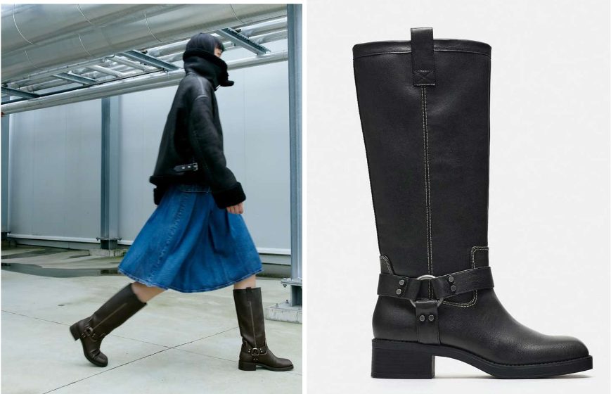 La bota biker pespuntes de Zara es un tipo de bota alta de estilo biker, con un detalle de pespuntes en contraste. Tiene una hebilla en el lateral y tiradores laterales. Son las más parecidas a las botas biker que aman tanto Rosalía como Dualipa, y que agregan rebeldía a sus outfits.