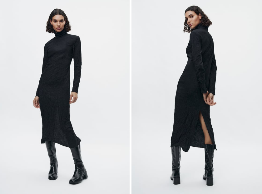 El vestido fruncido ZW de edición limitada de Zara es un vestido midi confeccionado con un tejido de mezcla de viscosa. Tiene cuello alto, manga larga rematada con cremalleras y detalles en tejido arrugado. El vestido está disponible en un clásico color negro y está disponible desde la talla XS hasta la XL.