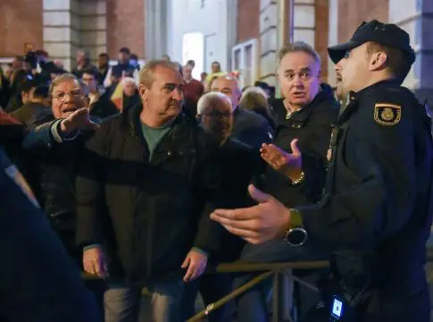 Entre enseñas nacionales y con carteles exclamando 'No al golpe de Estado', algunos de los asistentes también se han encarado a los agentes aunque, de momento, sin incidentes reseñables. También había banderas de Revuelta, la organización juvenil de la órbita de Vox, y de Democracia nacional, un partido político extraparlamentario. Se han escuchado además cánticos a favor de la unidad de España, contra el presidente Pedro Sánchez y el himno de la Falange de las JONS, el 'Cara al sol'.