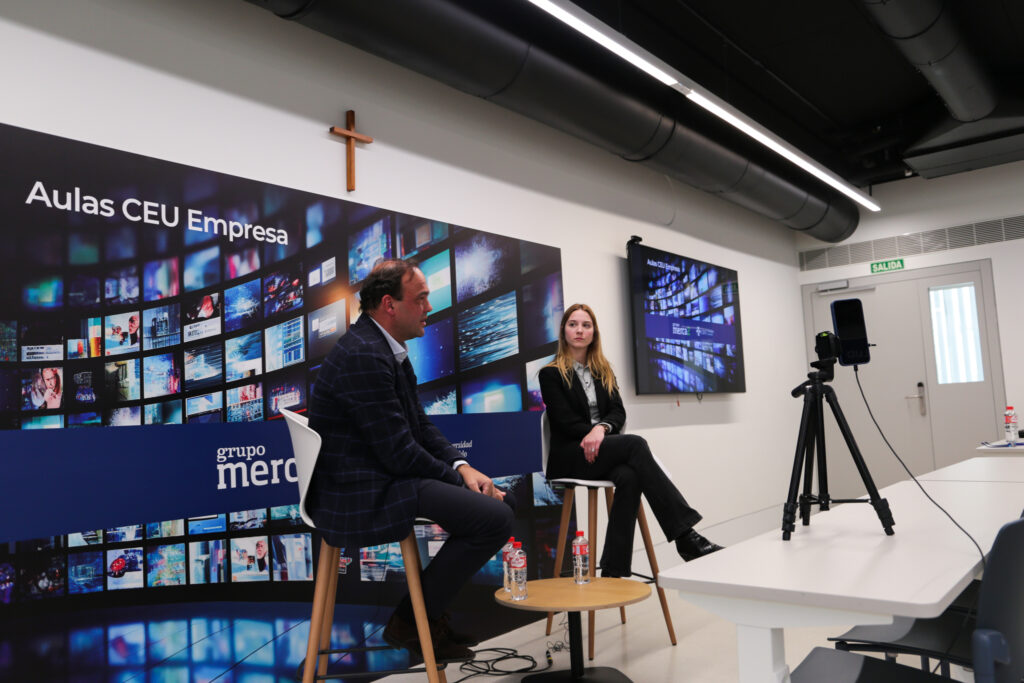 El pasado 5 de febrero , el economista José Carlos Díez inauguró en la Facultad de Humanidades y Ciencias de la Comunicación del CEU el Aula empresa de Merca-2 . Durante la entrevista, compartió su trayectoria profesional y respondió a varias preguntas de los alumnos. Este medio engloba una amplia variedad de temas de actualidad, desde economía hasta salud o estilo de vida. Estas aulas representan una apuesta para fomentar la colaboración entre el mundo profesional y académico, ofreciendo acuerdos estratégicos con empresas destacadas del panorama nacional para mejorar la empleabilidad de los alumnos.