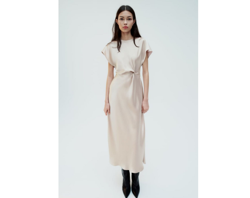 El vestido midi de satén con cintura fruncida de Zara es una pieza elegante y versátil que se puede vestir de forma elegante o informal. Está hecho de una suave tela satinada y cae maravillosamente sobre el cuerpo. Tiene escote redondo, manga corta y cintura fruncida que acentúa la cintura. La falda llega hasta más bajo de la rodilla y tiene una abertura lateral para facilitar el movimiento.