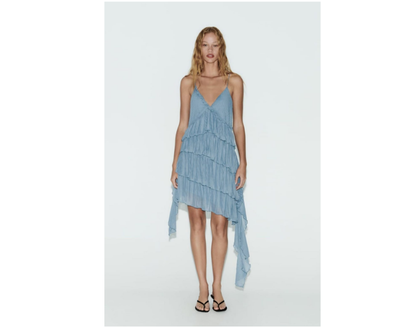 El vestido asimétrico plisado de Zara es una prenda versátil y favorecedora confeccionada en un tejido plisado fluido que cae en cascada por el cuerpo. El escote en V y el dobladillo alto le dan al vestido un toque moderno y elegante. Se puede usar con tacones para un look de noche, o con sandalias o zapatillas para un look más informal. Lo llevas a precio de oferta en 12,99 euros.