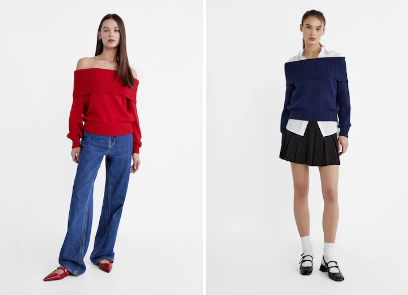 El jersey de punto con hombros descubiertos de Stradivarius es una prenda versátil y favorecedora que está confeccionada con un tejido de punto suave y cómodo y presenta un diseño de hombros descubiertos con mangas largas. El jersey está disponible en una variedad de colores, incluidos negro, crudo y este bellísimo color rojo tan en tendencia para 2024.