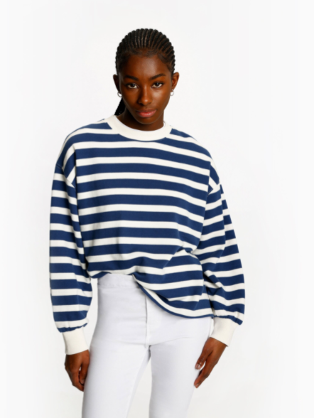 La sudadera de rayas de Lefties es una sudadera de manga larga con rayas marineras crudas en un precioso color azul marino. Está confeccionada en 100% algodón y tiene un ajuste holgado. La sudadera tiene un escote redondo, puños y dobladillo acanalados.