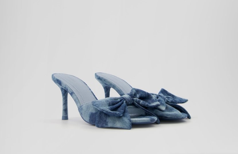 Este zapato está hecho de un material denim suave y tiene un tacón alto y delgado. El lazo en la parte delantera del zapato añade un toque femenino, muy acorde a la moda coquette. El zapato está disponible en azul claro y azul oscuro.