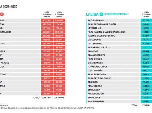 LaLiga ha dado a conocer este martes la última actualización de los límites de coste de la plantilla deportiva de los clubes de LaLiga EA Sports y LaLiga Hypermotion, tras el reciente mercado de traspasos de invierno, y el FC Barcelona ha vuelto a ver reducido su margen de límite salarial hasta los 204 millones de euros, por los 727 millones que tiene el Real Madrid (quien más tiene) o los 31 del Deportivo Alavés, que cierra la tabla.