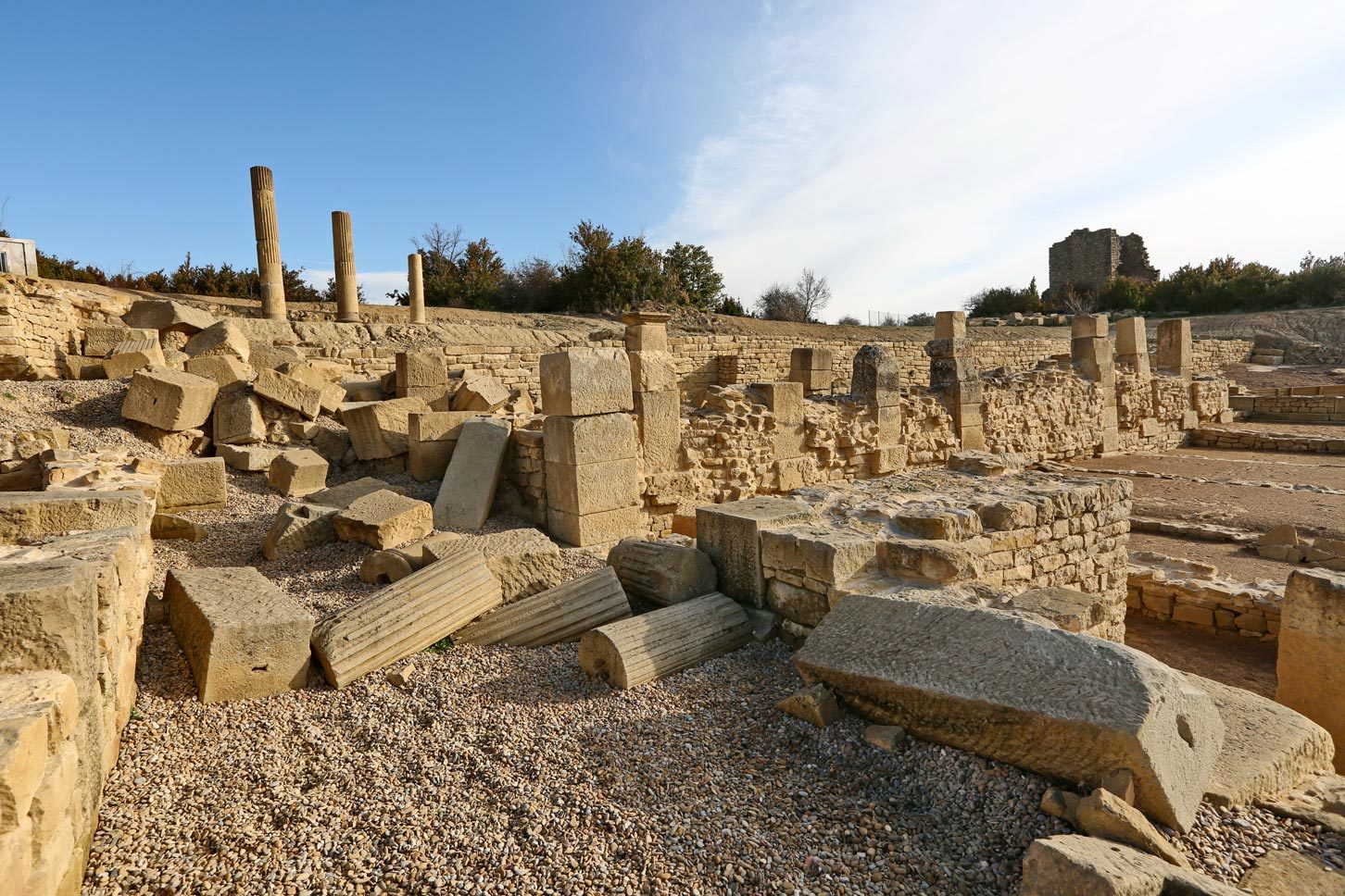 Explorar las ruinas de Santa Criz es sumergirse en la vida de los habitantes que ocuparon la región entre los siglos I y II. El foro, el corazón social, comercial y religioso de la ciudad romana, revela secretos arquitectónicos y decorativos asombrosos. La basílica, con su profusa decoración de columnas y capiteles, se erige majestuosamente en la parte meridional de la plaza del foro, deslumbrando a los visitantes con su grandeza histórica. Sin embargo, este viaje al pasado es solo el comienzo, ya que las excavaciones han desenterrado solo una tercera parte de esta impresionante plaza.