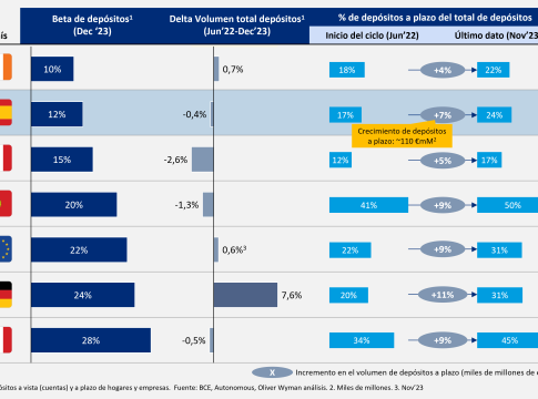 Artiom Arkhangelskiy, Socio de la Industria de Servicios Financieros de Oliver Wyman, enfatiza que "adoptar un enfoque analítico y operativo de las entidades puede optimizar los costes de los depósitos hasta en 43.000 millones de euros al año para los bancos europeos y británicos. En el caso de los bancos españoles, una gestión eficiente de los depósitos podría tener un impacto en sus costes de aproximadamente entre un 10% y 15%, lo que supone hasta 1.500 millones de euros al año y un impacto de sus resultados de hasta un 0,6% del ROE".