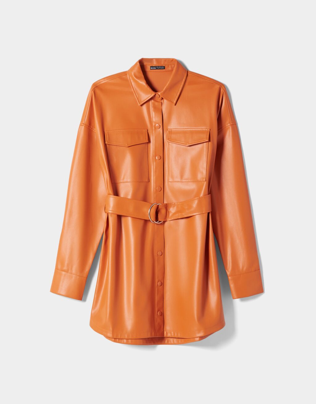 Repetimos con otro vestido camisero, un estilo que está en máxima tendencia esta temporada. En este caso está confeccionado con un tejido de poliuretano de imitación piel, un material que también está arrasando en todo tipo de prendas. El corte es mini, con el bajo redondeado, manga larga con puños y dos bolsillos con solapa en la parte frontal. Tiene el cuello kent clásico de la camisa tradicional y cierra con botones a presión en el mismo color. Para estilizar la silueta tiene un cinturón en el mimo material con cierre de aros metálicos plateados. Hay dos colores disponibles: camel y negro. El precio con el 50% de descuento se queda en 19,87 €.