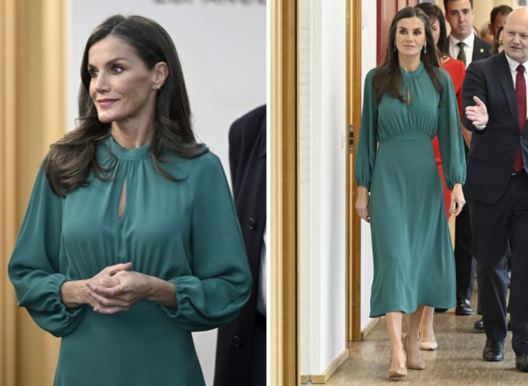 Para el acto, la reina Letizia ha lucido un vestido verde de la firma Dandara, el cual la hizo lucir regia, acaparando rápidamente la atención. El vestido de corte midi, con mangas largas y abullonadas, y cuello perkins, cuenta además con una abertura en forma de lágrima sobre el pecho, lo que aporta un toque diferente y elegante.