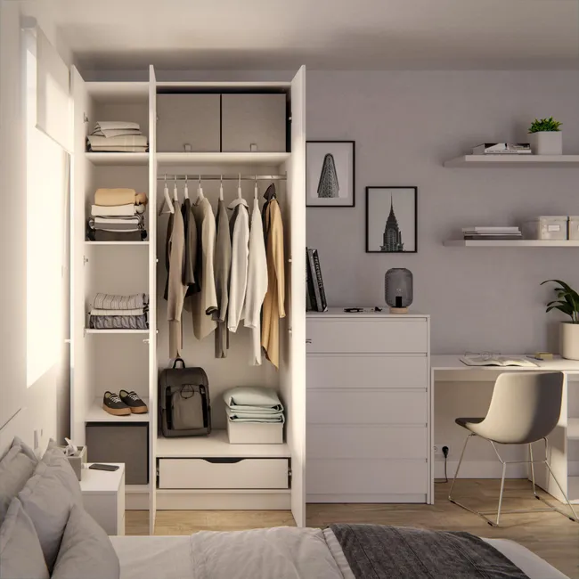Situar el armario en una esquina permite reducir su impacto visual en el pasillo, al quedar oculto parcialmente. Hay que aprovechar los huecos muertos. Con un poco de ingenio y alguna de estas soluciones de Leroy Merlin, es posible aprovechar pasillos estrechos que parece que no sirven para nada y convertirlos en prácticos espacios extra de almacenaje. ¡Manos a la obra!