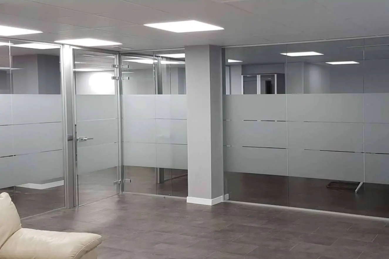 La gama de opciones disponibles incluye mamparas cristal laminar 5+5 y de cristal laminar con perfil de mampara sencilla, mampara doble mixta, doble con doble cristal, sencillas mixta, cristal laminar con puerta corredera, cristal laminar 5+5 con perfil doble, además de puertas de fuelle y mampara doble ciega. La empresa también ofrece un catálogo de productos y accesorios que complementan y mejoran la experiencia de las mamparas, tales como vinilos, estores y cortinas con diseños específicos para oficinas.