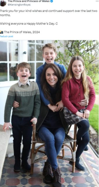 En la foto publicada en la red social X, aparece la princesa sentada y en compañía de sus tres hijos con el mensaje “Thank you for your kind wishes and continued support over the last two months. Wishing everyone a Happy Mother's Day. C” 📸 The Prince of Wales, 2024. (Gracias por sus amables deseos y continuo apoyo durante los últimos dos meses. Deseándoles a todos un Feliz Día de la Madre. C 📸 El Príncipe de Gales, 2024). Tal como señalan en la publicación, la foto ha sido tomada por el propio príncipe Guillermo.