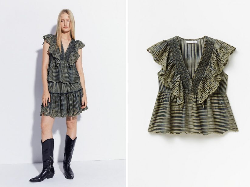 Está confeccionada en algodón 100% con gomas Schiffli e hilos metalizados. Destaca por sus volantes en las mangas, lo que le agrega un toque de encanto a cualquier look primaveral. Además, su diseño elegante y femenino la hace ideal para lucir sofisticada y fresca en cualquier ocasión. El precio de la blusa es de 25,99 €.