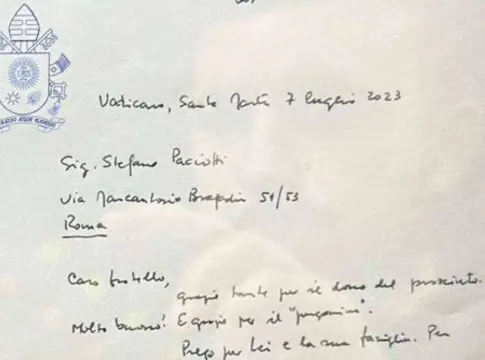 Esta extraordinaria oportunidad surgió durante una reunión en el consulado español, donde el delegado papal quedó impresionado por la calidad del producto y solicitó una muestra para el Santo Padre. Días más tarde, su Santidad hizo llegar una carta a Stefano Paciotti para agradecerle y felicitarle por hacerle llegar dicho producto para deleitar su paladar. Posteriormente, Paciotti además recibió una llamada del Papa Francisco, quien le mostró personalmente su asombro ante tan exquisito “cotto” (jamón cocido en italiano).