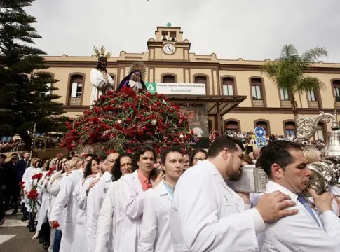En este momento, sobre las 10.30 horas, los hombres de trono han cedido sus puestos debajo de las andas a sanitarios, entre ellos el delegado de Salud, Carlos Bautista, que con sus batas blancas y su emoción han portado el trono hasta dentro del recinto hospitalario para una celebración religiosa y la entrega de medallas de la hermandad a enfermos.